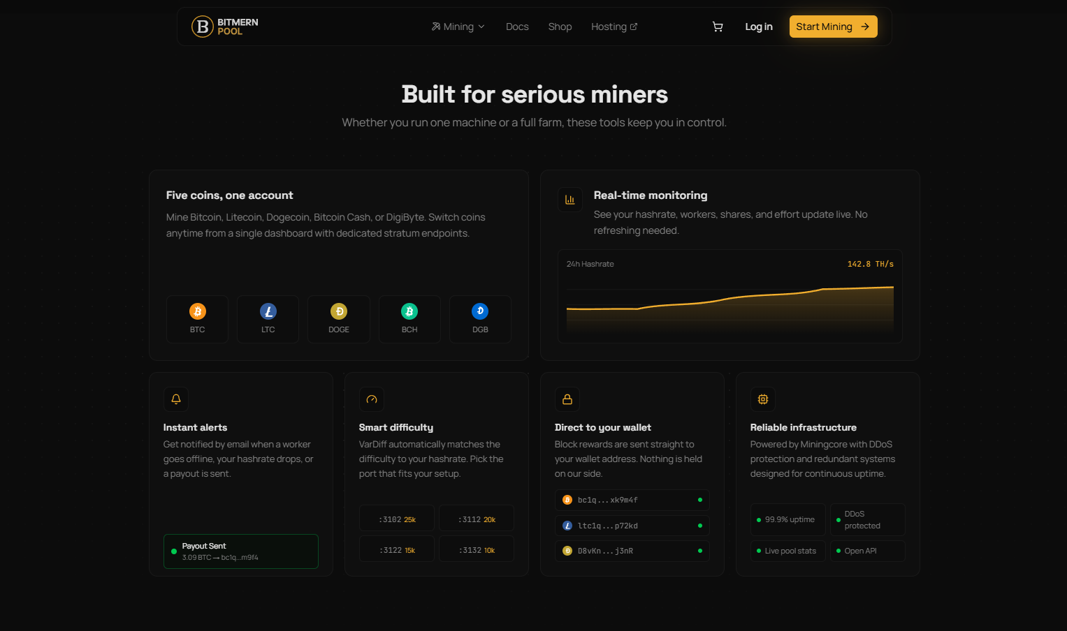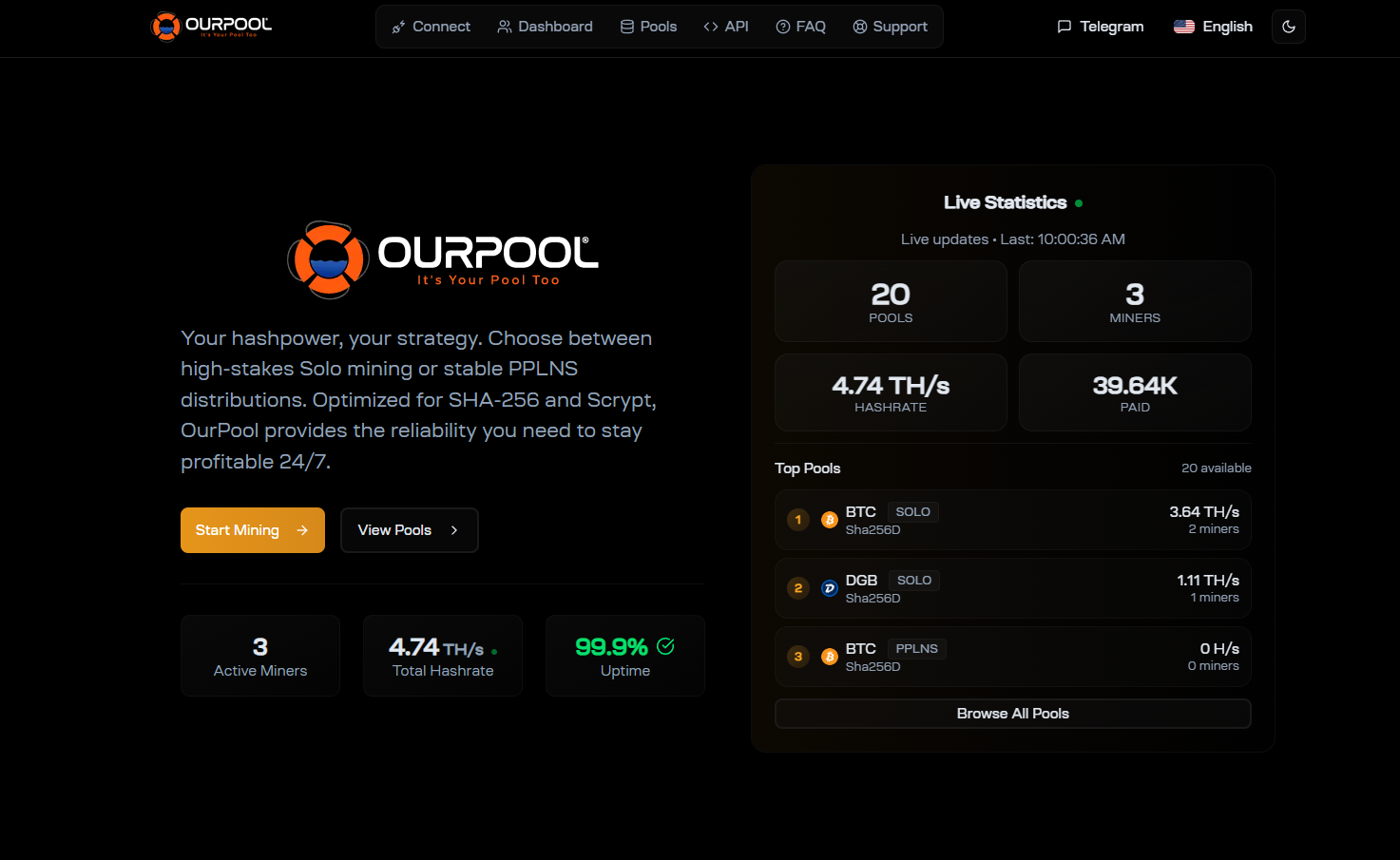High-performance cryptocurrency mining pool infrastructure with real-time hash tracking and automated payout systems.